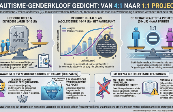 Jarenlang gold het als een ongeschreven regel: autisme is een conditie die voornamelijk jongens en mannen betreft. De statistische verhouding van vier jongens op één meisje leek in steen gebeiteld. Een baanbrekend onderzoek, gepubliceerd in The BMJ (2026), waarin 2,7 miljoen levensverhalen werden geanalyseerd, lijkt dit beeld te verbrijzelen. Toch noopt het onderzoek volgens sommige lezers tot nuance.