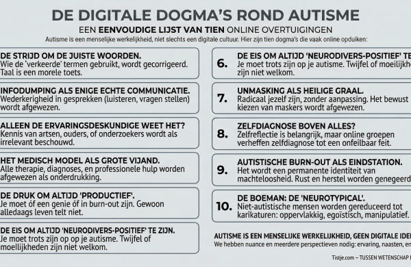 In dit artikel beschrijf ik de complexe wrijvingen tussen autisme en digitale cultuur. Ik beschrijf tien dogma’s die binnen de online autismegemeenschap zijn ontstaan, zoals de strijd om taal en zelfdiagnose. Ik pleit voor een evenwicht tussen ervaringskennis en expertisen en benadrukt het belang van inclusie en nuance.