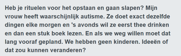 Overigens zou ik iemand (man of vrouw) met op ’t eerste gezicht onveranderlijke routines of rituelen, of het zorgvuldig willen plannen en voorbereiden van een uitstap of reis, niet meteen een vermoeden van autisme toeschrijven.