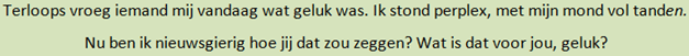Maar om in één twee drie aan iemand te zeggen wat geluk voor mij is? Iemand die houdt van platitudes zou wellicht zeggen dat het voor iedereen anders is, of dat iedereen zo verschillend is of iets in die aard.