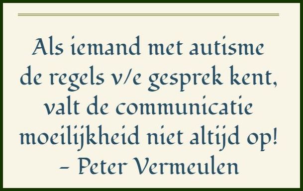 Als je de regels van het gesprek kent … 18 augustus 2015 Geef een reactie In het Radio 1-programma #weetikveel met Koen Fillet (@filletik) (Radio 1) en Peter Vermeulen (@Peter_Autisme) Deel deze blog Klik om te delen op Facebook (Opent in een nieuw venster) Facebook Klik om te delen op X (Opent in een nieuw venster) X Klik om op Pinterest te delen (Opent in een nieuw venster) Pinterest Klik om te delen op Print & PDF (Opent in een nieuw venster) Print & PDF Klik om dit te e-mailen naar een vriend (Opent in een nieuw venster) E-mail Klik om op LinkedIn te delen (Opent in een nieuw venster) LinkedIn Klik om af te drukken (Opent in een nieuw venster) Print Klik om op Tumblr te delen (Opent in een nieuw venster) Tumblr Vind-ik-leuk Aan het laden... Gerelateerd autisme #weetikveel, autisme, Autisme Centraal, communicatie, gesprek, last, Peter Vermeulen, Radio 1, regels