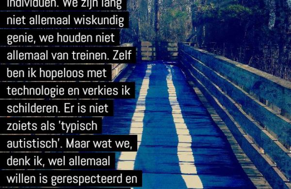 Citaat van Jeanette Purkis, een Australische ambtenaar, auteur (van onder andere boeken rond werk en psychologische ondersteuning voor mensen met autisme) en gepassioneerd belangenverdediger voor mensen met autisme en hun omgeving over het individuele en het mogelijks collectieve in de beleving van mensen met autisme.