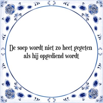 Het valt dus allemaal wel mee met die zogenaamde soep. Al was het in vroeger tijden vooral pap die niet zo heet gegeten werd als ze werd gekookt. En nog vroeger was het gewoon hete brei. Die vermoedelijk in een pot werd gekookt waar veel rond gedraaid werd. In elk geval, het valt mee met wat slecht nieuws is, of op een slecht vooruitzicht wijst. Of dat wil een ander me toch wijsmaken.