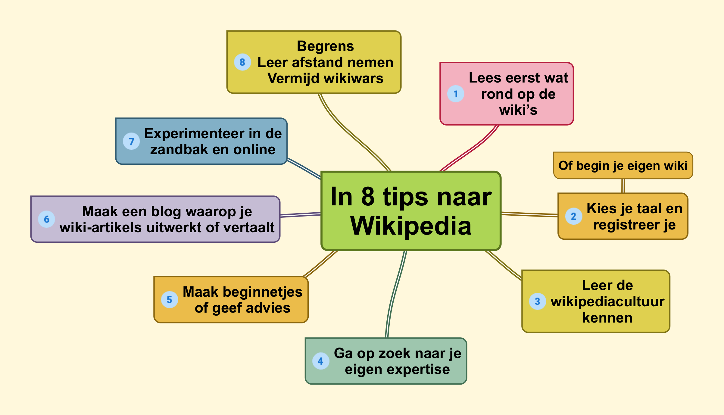 In onderstaande schema geef ik een overzicht van acht tips vanuit mijn ervaringen met de Wikipedia-gemeenschap. Hieronder licht ik het schema kort toe.