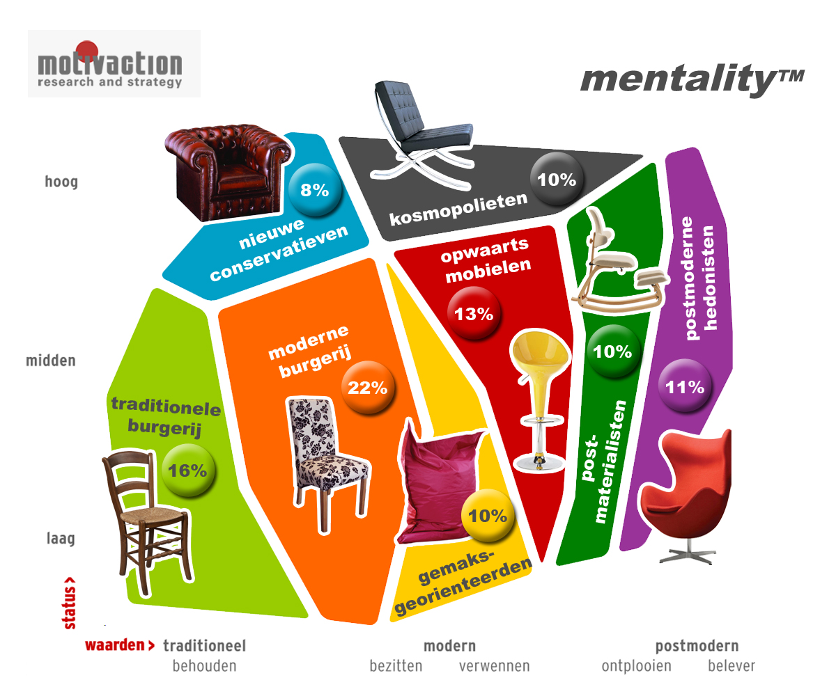 De Moderne Burger komt het vaakst voor. Hij of zij is statusgevoelig, plant het leven zorgvuldig, is toekomstgericht en streeft naar financiële zekerheid. De Traditionele Burgerij (plichtsgetrouw, maatschappelijk betrokken en aandacht voor gezin) en de Opwaarts Mobielen (materialistisch, gericht op carrière en presteren) nemen in Nederland met respectievelijk 16 procent en 13 procent de tweede en derde plek in.