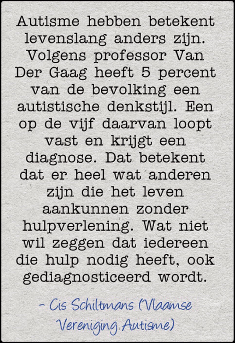 Hulpverleners die de autist als volwaardige mens zien en niet als een klant met een lange lijst gebreken zijn inderdaad uiterst belangrijk. Het is al moeilijk genoeg om een diagnose te krijgen na een leven lang buitengesloten te zijn, zonder dat men voortdurend met dedain wordt behandeld door de “Hulpverlener”aan de overkant van de tafel. Als de hulpverlener autistische mensen niet kan accepteren, dan zal de autist zich zelf nooit kuunen acceptern. Het spijt mij. Ik val in herhaling.