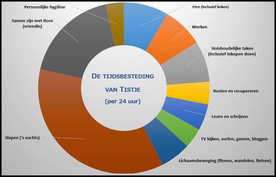 Enige tijd terug heb ik zelf een paar weken bijgehouden aan wat ik in 24 uur gemiddeld het meest tijd besteed. Daarin ben ik Het lijkt vanzelfsprekend, maar ik wil toch nog eens benadrukken dat dit natuurlijk niet veralgemeend mag worden voor alle autisten. Het geeft bovendien maar een beeld van hoe ik op dat moment mijn tijd besteedde. Met ‘samen zijn’ bedoel ik vooral iets samen doen, zoals samen praten, wandelen, knuffelen of inkopen doen. Natuurlijk gebeurt het dat ik ook op andere momenten samen ben met mijn liefste, maar de (toevallig donkergrijze) kleur in de grafiek hieronder verwijst naar de tijd waarin ik probeer met niets anders bezig te zijn.