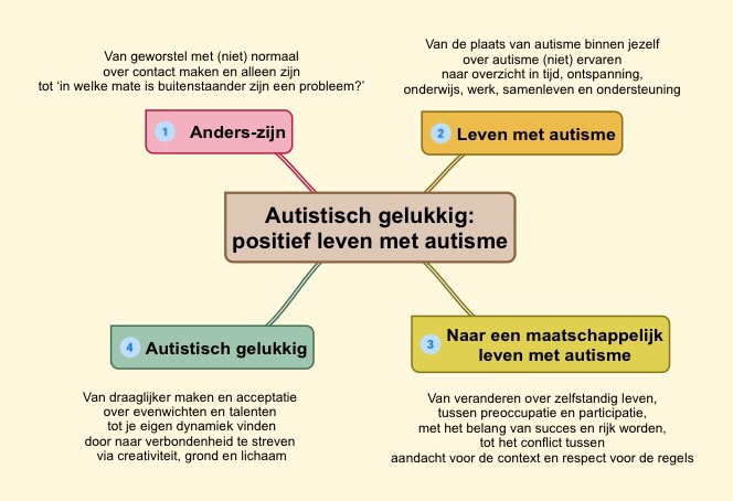 In ‘Autistisch gelukkig: positief leven met autisme’ vertel ik over mijn weg naar autistisch gelukkig zijn. Onderstaande mindmap, die u aan het begin van het boek vind, geeft de inhoud grafisch weer.