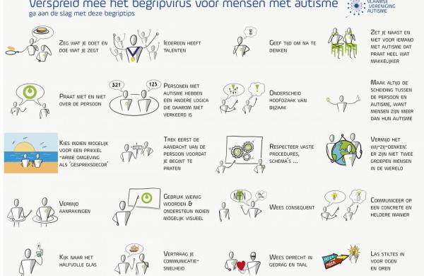 Met deze poster en onderstaande tips van de Vlaamse Vereniging Autisme en de website Participate! Autisme kan je aan de slag om een goede communicatie en omgang met mensen met autisme een stapje dichterbij te brengen.