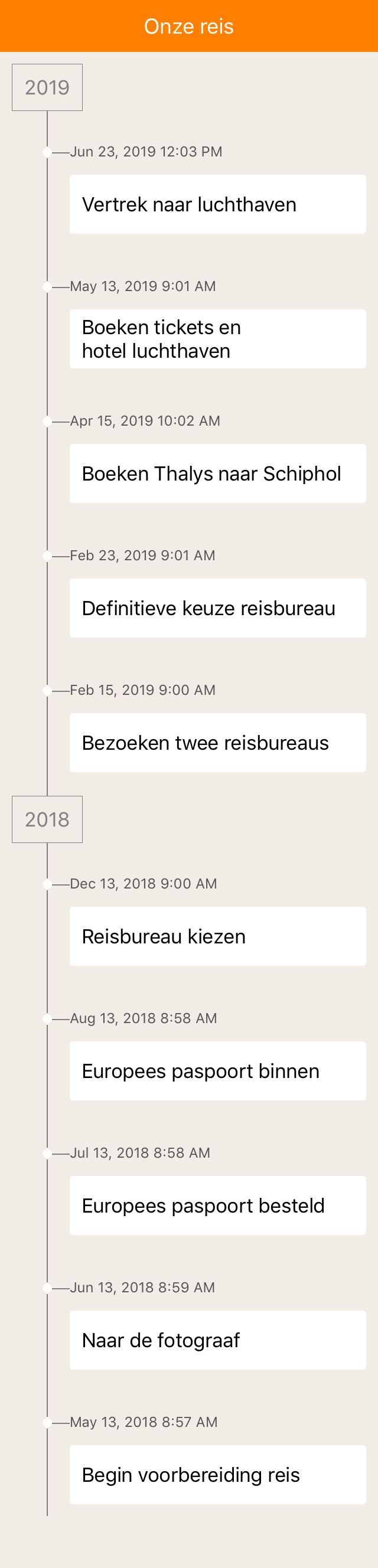 Voor ons is deze reis begonnen met het opstellen van een tijdlijn. Bijvoorbeeld via de Ios-app ‘Timeline‘. Met bovenaan de datum waarop we de knop doorhakten om op reis te gaan. Met onderaan de datum waarop we verondersteld worden ons ‘gewone’ leven weer op te vatten. Aanvankelijk is die tijdlijn natuurlijk vrij kaal. Zo’n tijdlijn kan je visualiseren door behangpapier op te hangen op een vrije muur, en daar met viltstift een lange lijn op te trekken. Of je kan het, zoals ik het doe, in een tekstdocument op je tablet meenemen.
