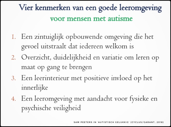 ‘Vier kenmerken van een goede leeromgeving voor mensen met autisme’ … autisme en onderwijs 1 september 2019 Geef een reactie Op 1 september verwijs ik graag naar het hoofdstuk ‘onderwijs vanuit een ander ontwikkelingsritme’ in mijn boek ‘Autistisch Gelukkig: Positief leven met autisme’ (Cyclus/Garant, 2018) waarin deze tips een voor een uitgebreider aan bod komen. Deel deze blog Klik om te delen op Facebook (Opent in een nieuw venster) Facebook Klik om te delen op X (Opent in een nieuw venster) X Klik om op Pinterest te delen (Opent in een nieuw venster) Pinterest Klik om te delen op Print & PDF (Opent in een nieuw venster) Print & PDF Klik om dit te e-mailen naar een vriend (Opent in een nieuw venster) E-mail Klik om op LinkedIn te delen (Opent in een nieuw venster) LinkedIn Klik om af te drukken (Opent in een nieuw venster) Print Klik om op Tumblr te delen (Opent in een nieuw venster) Tumblr Vind-ik-leuk Aan het laden... Gerelateerd autisme autisme, boek, geluk, leren, Leven met autisme, onderwijs, ontwikkelingsritme, positief, studeren, tips