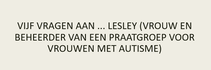 In bijna elke mail, elk bericht en elke reactie die ik in mijn mail krijg, komt de vraag of het verzoek om meer slimme, creatieve, handige vrouwen met autisme op mijn blog aan het woord te laten. Hoewel deze blog natuurlijk in de eerste plaats iets persoonlijks is, probeer ik dat af en toe te doen. Toch is dat niet zo eenvoudig als het lijkt. Ik ben dan ook heel blij dat Lesley, vrouw met autisme en beheerder van een praatgroep voor vrouwen met autisme, toegestemd heeft om toe te stemmen voor mijn ‘Vijf vragen’-reeks.