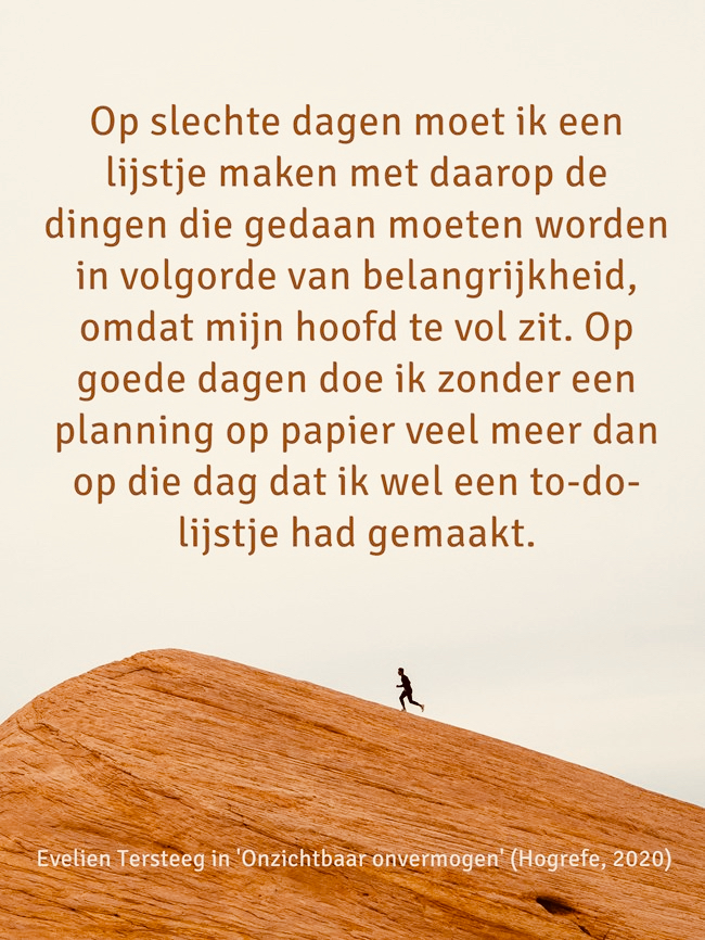 “Op slechte dagen moet ik een lijstje maken met daarop de dingen die gedaan moeten worden in volgorde van belangrijkheid, omdat mijn hoofd te vol zit. Op goede dagen doe ik zonder een planning op papier veel meer dan op die dag dat ik wel een to-do-lijstje had gemaakt.” – Evelien Tersteeg in ‘Onzichtbaar onvermogen: een kijkje in het leven van een autistische vrouw’ (Hogrefe, 2020). Gemaakt met behulp van Quozio. Layout door Tistje. Delen van de afbeelding mag, met vermelding van de blog Tistje.com.