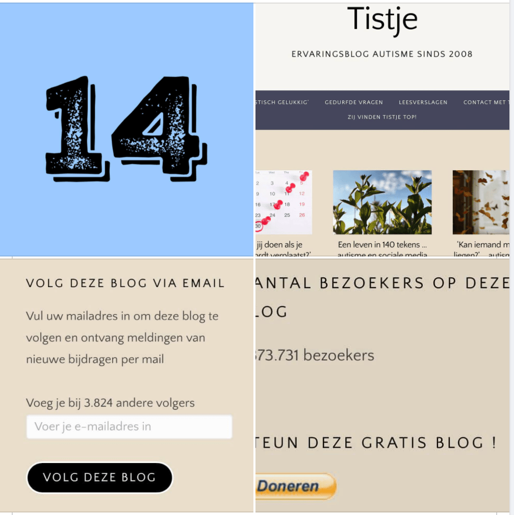 Ruim 14 jaar geleden, op 8 februari 2008, begon ik met deze blog. Dat was vooral omdat ik gevraagd was om een column over autismebeleving te schrijven, en ik vond dat een blog daar goed bij paste. Een ander reden van het opzetten van een blog was dat ik een beetje bang was dat ik geen inspiratie zou vinden op het moment van de deadline van de column. Af en toe vingeroefeningen zetten op een blog, die vermoedelijk niemand zou lezen, vond ik toen een goed idee.