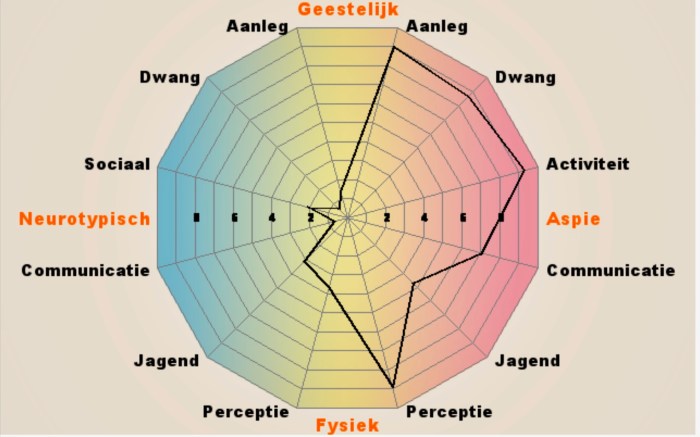 De Aspie-Quiz is erg gedetailleerd, kan zelf gescoord worden, heeft een breed scala aan vraag types, er zijn uitgebreide statistische gegevens online beschikbaar en je kan zowel zien hoe autistisch als hoe neurotypisch je bent, zowel visueel, kwantitatief als kwalitatief. De ‘look en feel’ doet eerder oldschool nerdy aan en de vragen zijn vrij voorspelbaar.