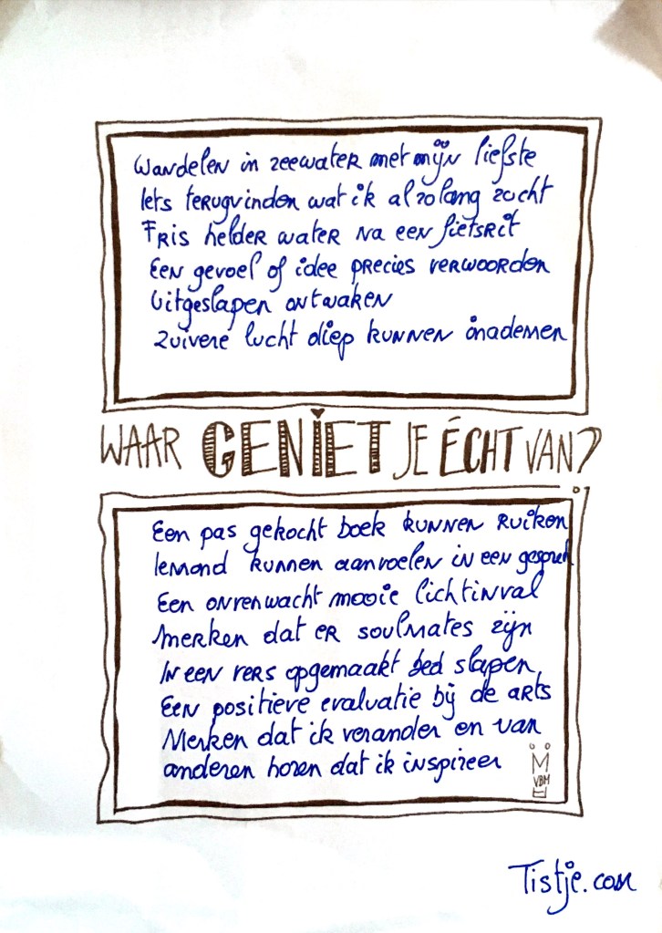 Ik heb het zelf meer voor lijstjes met wat al gedaan is, met wat voor mij een positieve indruk heeft, wat ik misschien nog eens wil doen of wat ik misschien liever gewoon wil herinneren. Eén van de lijstjes die ik wel eens maak, op een gewonnen dag, zoals vandaag, is een opsomming van wat ik echt kan genieten.