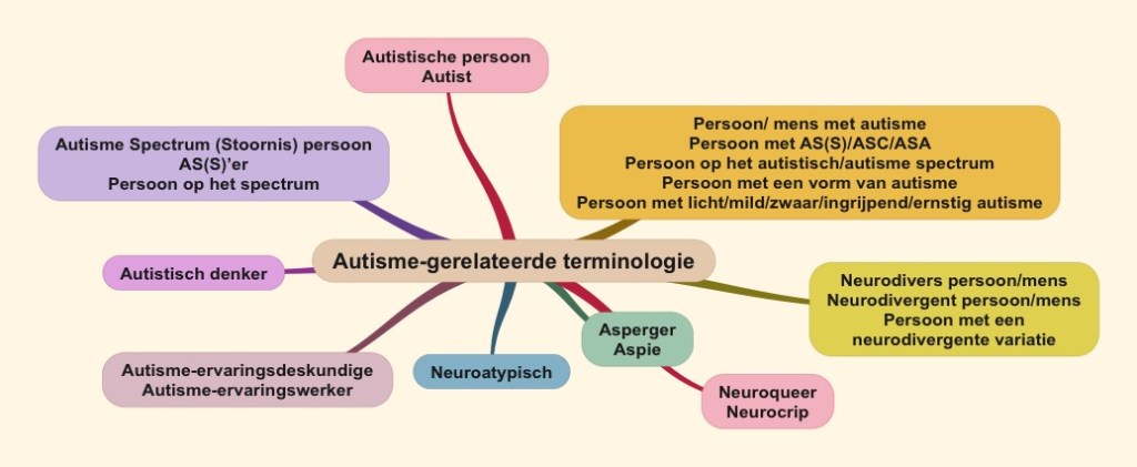 - Autismespectrumpersoon, ASS’er, Persoon op het spectrum: Deze groep is een mengeling van termen die vooral in medische settings worden gebruikt en afkortingen ervan. De term ‘persoon op het (autisme)’spectrum’ wordt vooral in professionele, academische of medische contexten gebruikt om te verwijzen naar iemand met een formele autismediagnose. De term ‘persoon op het spectrum’ wordt soms door autistische mensen gebruikt als alternatief voor de benaming ‘een vorm van autisme’. In de populaire media wordt ook soms verwezen naar iemand die op het spectrum ‘zit’ of ‘schommelt’.