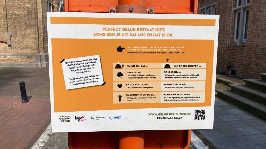 Enkele stappen verwijderd van ons domein, vlak voor de oude kerk, staat het oranje bord hierboven, met het opschrift ‘Perfect geluk bestaat niet. Soms ben je uit balans en dat is ok’. Het bord is een van de rustplaatsen op de ‘gelukswandeling’ die je door onze streek voert. Er zijn nog gelukswandelingen in Vlaanderen, lees op de website van de ‘geluksdriehoek‘.