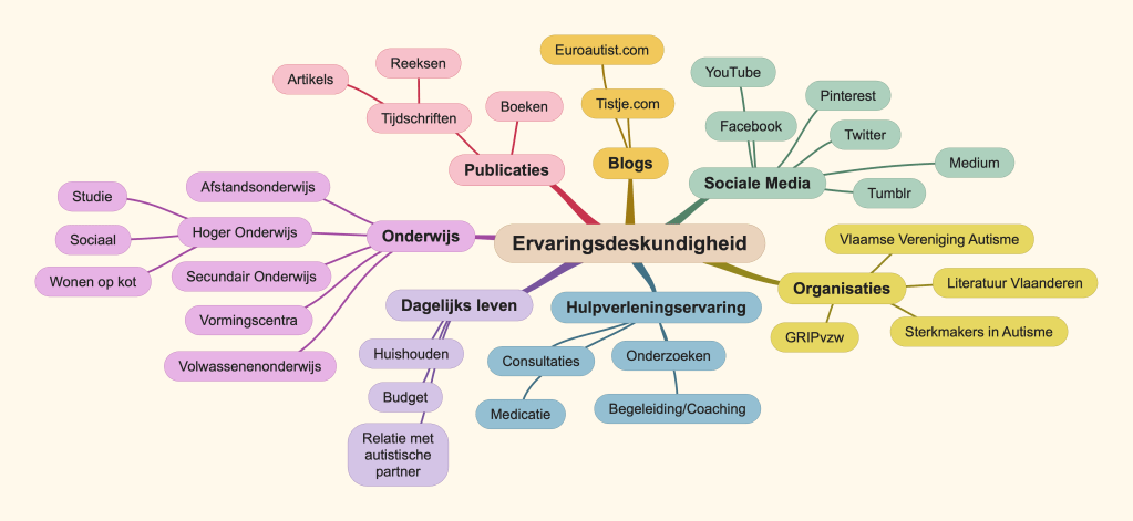 - Persoonlijke ervaring: Alles wat ik deel, komt direct uit mijn eigen leven. Het is wat ik zelf heb meegemaakt en wat voor mij werkt. Het is best mogelijk dat dit voor anderen niet of niet in dezelfde mate werkt, of zelfs onherkenbaar is. In bovenstaande mindmap heb ik mijn ervaringsdeskundigheid gevisualiseerd.