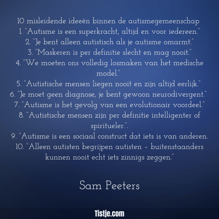 Deze uitspraken komen meestal voort uit goede bedoelingen. Uit hoop, uit pijn, uit een verlangen erbij te horen. Maar zodra ze regels worden, gaan ze wringen. We hebben geen slogans nodig, maar verhalen. Geen dogma’s, maar tegenstrijdigheden. De waarheid over autisme is geen simpele zin. Het is een lappendeken van ervaringen, vol spanning en nuance. En soms is het meest radicale wat je kunt doen: vrede sluiten met de rommeligheid.