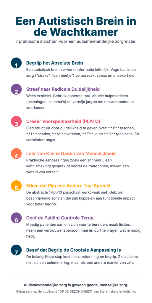 De publicatie Op je gezondheid! bracht herkenning. Niet door grote theorieën, maar door verhalen en inzichten die mijn eigen worsteling een stem geven. Dit zijn de zeven inzichten die ik eruit meeneem – inzichten die zorg autismevriendelijker én menselijker maken.