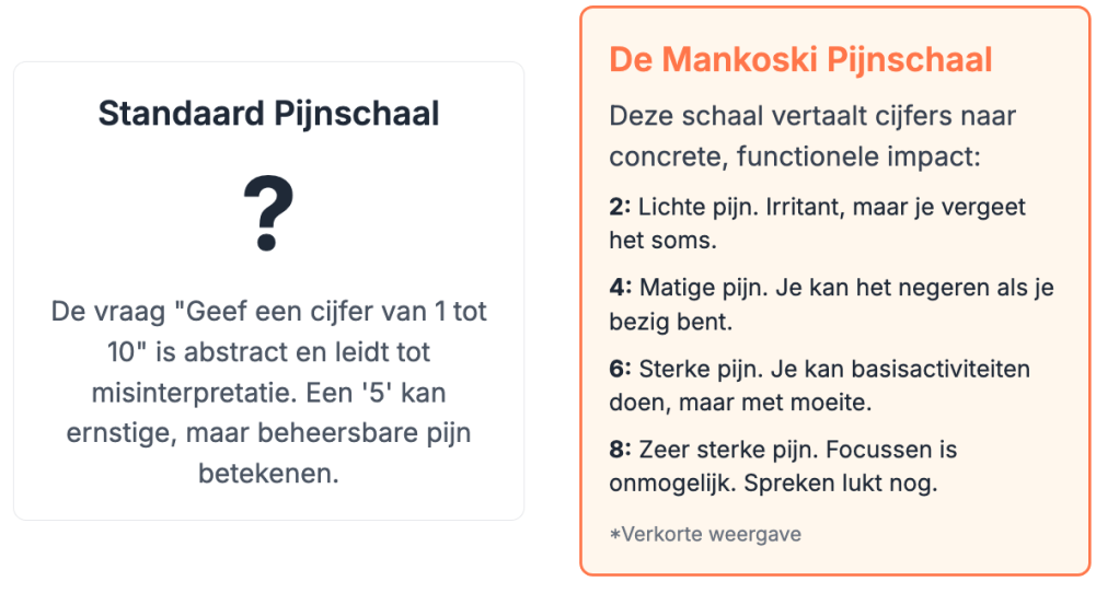 Door de jaren heen heb ik geleerd dat mijn pijn anders communiceert. De abstracte vraag “hoeveel pijn heb je op een schaal van 1 tot 10?” is een wiskundig raadsel. Dus geef ik een 5, en wordt mijn pijn als ‘matig’ gecatalogeerd, terwijl mijn lichaam vanbinnen schreeuwt. Een pijnschaal met beschrijvingen, zoals de Mankoski-schaal, is oneindig veel nuttiger. Het vertaalt een abstract cijfer naar een concrete, functionele impact. Luister naar de ervaring, niet alleen naar de symptomen.