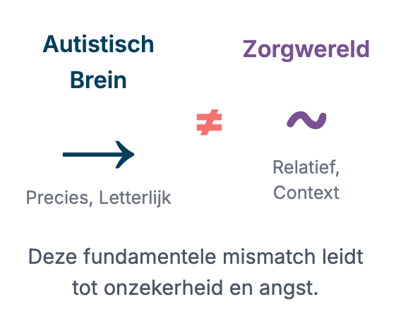 Het begint allemaal bij de basis: autisme is geen set van gedragingen, maar een andere manier van informatie verwerken. Het autistische brein, mijn brein, denkt absoluut en precies. Als een arts zegt “beweeg wat meer”, dan is dat geen vrijblijvend advies, maar een concrete opdracht. De wereld van de gezondheidszorg, daarentegen, is een en al relativiteit. “Straks”, “een beetje pijn”, “binnen enkele dagen”… het zijn voor veel autistische mensen mistbanken van onzekerheid.