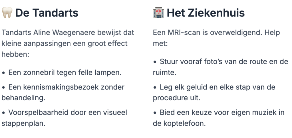 Ook in het ziekenhuis kunnen kleine aanpassingen een wereld van verschil maken. Stuur vooraf foto’s van de route. Wees duidelijk over je verwachtingen. Leg elk geluid bij een MRI-scan uit. Bied de keuze voor eigen muziek. Deze kleine daden van controle geven een gevoel van veiligheid in een overweldigende omgeving.