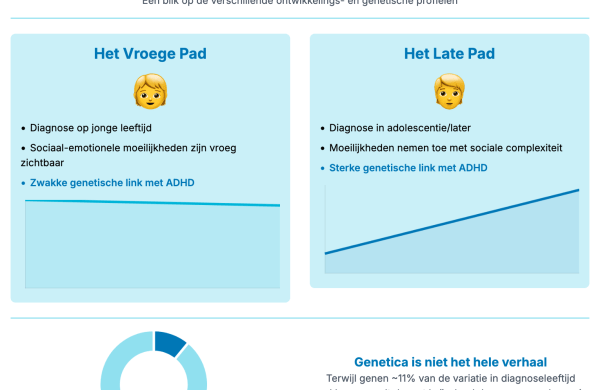 Nieuw onderzoek toont twee ontwikkelingspaden binnen autisme, elk met een eigen genetisch profiel. Het ‘vroege pad’ wordt gekenmerkt door een diagnose op jonge leeftijd en een zwakke genetische link met ADHD. Bij het ‘late pad’ manifesteren moeilijkheden zich later en is er een sterke genetische overlap met ADHD. Hoewel genetica circa 11% verklaart, bepalen omgevings- en persoonlijke factoren grotendeels de leeftijd van diagnose. Ik bespreek het artikel vanuit eigen perspectief en voeg enkele kritische noten bij.