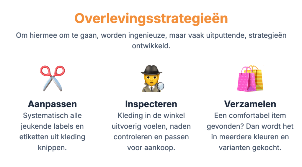 Om dit mijnenveld te navigeren, ontwikkelen de autistische volwassenen die in het onderzoek betrokken waren, ingenieuze strategieën: veelvouden kopen van een comfortabel item, kleding grondig inspecteren online en/of in de winkel en systematisch alle labels verwijderen. Voor zover de informatie daarop de werkelijke stof weergeeft, wat in de praktijk niet steeds het geval blijkt.