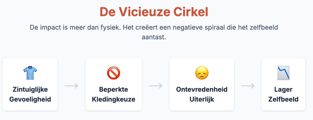Dit is dus veel meer dan ongemak dat door het ‘weg te denken’ zou verholpen kunnen worden. Het is veeleer een stevige drempel tot inclusief functioneren in het dagelijks leven. Oncomfortabele kleding kan de concentratie ondermijnen en een reden zijn om sociale evenementen te vermijden. Een formele dresscode of een verplicht uniform kan een onoverkomelijk obstakel vormen.