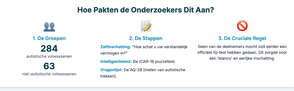 - Zelfinschatting: Ze kregen de vraag “Kunt u zelf een inschatting maken van uw verstandelijk vermogen?”. Ze konden dan een categorie kiezen, zoals “Gemiddeld (IQ 86-115)” of “Bovengemiddeld (IQ 116-130)”.
