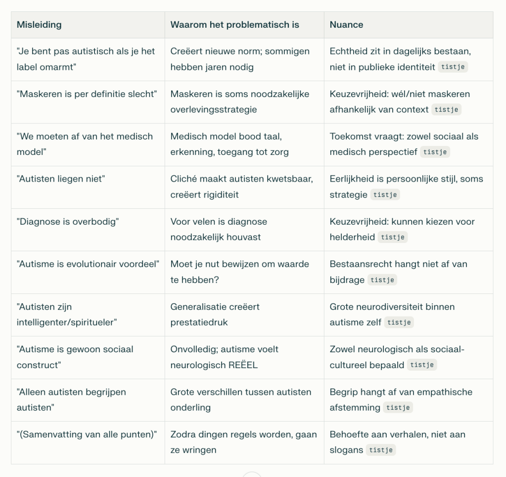 Ik schreef over hoe we zeggen dat maskeren per definitie slecht is—maar voor velen is het een manier om te overleven en ook zin te geven aan hun leven. Over hoe we roepen dat we af moeten van het medisch model—maar dat model geeft taal en toegang tot ondersteuning. Over hoe we beweren dat autisten niet liegen—maar eerlijkheid is een keuze, geen biologie.