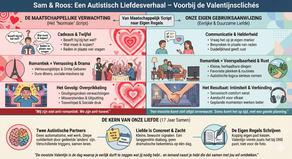 Valentijnsdag laat elk jaar opnieuw zien hoe smal het maatschappelijke beeld van liefde vaak is. Op deze blog probeer ik al sinds februari 2008 te laten zien dat er veel meer verhalen zijn dan dat ene script. Het onze is er één van: twee autistische mensen, zeventien jaar samen, niet omdat we het spel van de romantiek zo goed meespelen, maar omdat we koppig onze eigen regels zijn blijven schrijven.