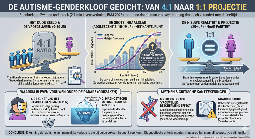 Jarenlang gold het als een ongeschreven regel: autisme is een conditie die voornamelijk jongens en mannen betreft. De statistische verhouding van vier jongens op één meisje leek in steen gebeiteld. Een baanbrekend onderzoek, gepubliceerd in het Britse tijdschrift British Medical Journal (februari, 2026), waarin 2,7 miljoen levensverhalen werden geanalyseerd, lijkt dit beeld te verbrijzelen. Toch vinden sommige lezers ook dat het nieuws genuanceerd moet worden.
