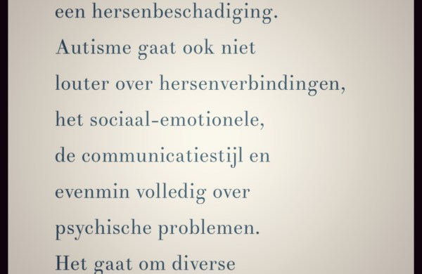 Donna Williams’ autobiografische getuigenissen in progress over wat zij zelf haar ‘autisme’ wil blijven noemen, hebben in niet geringe mate bijgedragen tot een soort cultstatus van het autisme als een vorm van aanpassing aan de hedendaagse samenleving, als een alternatieve vorm van ‘normaliteit’. Na achtereenvolgens drie onleefbare vormen van autisme doorworsteld te hebben, lijkt Williams momenteel te kunnen leven met een vierde vorm. Haar ‘vierde autisme’ bestaat uit een dubbele verknoping. Ze verknoopt niet alleen alle mogelijke diagnoses voor zichzelf maar en vooral vier statuten als ‘eerste autist die over… Read more De ‘autismen’ van Donna Williams →