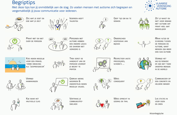 Bespreking van de 20 begriptips voor effectieve communicatie van de Vlaamse Vereniging Autisme besproken vanuit autistisch perspectief, met voor elke tip drie praktische voorbeelden vanuit eigen ervaringen en ervaringen met andere autistische personen.
