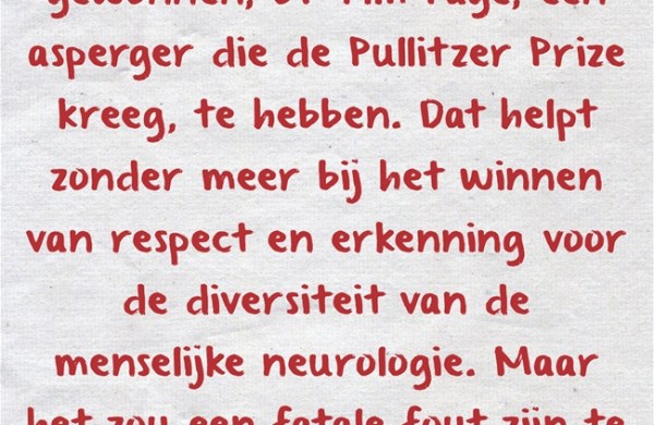 Het voornaamste dat iemand met autisme nodig heeft is een cheerleader, iemand die hem aanmoedigt op te houden met denken wat hij niet kan en zich goed te voelen over wat hij wel kan. Mijn voornaamste doel is hem te helpen bij het zich goed voelen over wat hij kan. en is. Als hij tevreden is over zichzelf, zullen alle therapieën beter werken. Hij moet ons ontmoeten, misschien niet halfweg maar ergens. Ik laat hem niet toe het hoofd te laten hangen, ik laat hem niet in bed liggen en… Read more ‘Mensen met autisme hebben een cheerleader nodig’ →