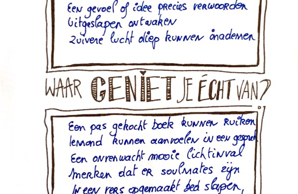 Een tweede lijstje uit de 30 lijstjes van Marjolein van Braam Morris. Vandaag dacht ik vooral aan waar ik nu echt van kan genieten. Opnieuw in mijn eigen handschrift.