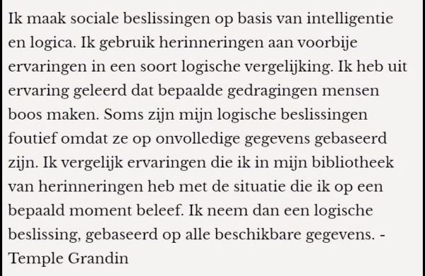 Een citaat van Temple Grandin overgenomen uit de brochure ‘Autisme begrijpen’ die hoort bij de informatieve website Particpate-Autisme. Over het systeem dat zij hanteert om tot sociale beslissingen te nemen en waarom die soms foutief kunnen zijn.