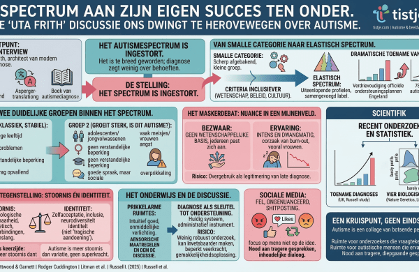 Uta Frith, een vooraanstaande autismeonderzoeker, stelt in Times Educational Supplement (TES) begin maart, dat het hedendaagse autismespectrum zijn betekenis verliest door toenemende inclusiviteit van diagnoses. Ze pleit voor erkenning van verschillende subgroepen en vraagt zich af of de term ‘autisme’ nog passend is. Haar kritische reflecties zijn van belang voor onderwijs en behandeling, maar stuiten op felle kritiek vanuit de autistische gemeenschap. In dit artikel ga ik dieper in op de inhoud en de ontvangst.